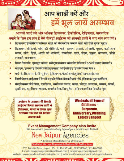 New Jaipur Handicraft is recognized as the leading suppliers of Wedding Decoration Items , Wedding Gifts & Artificial Flower Jewellery. We deals in all types Floral Jewellery & accessories for Wedding , Haldi, Mehendi & Engagement Ceremony. Our products are available online on major e-commerce sites.